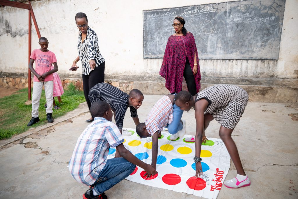 Dans la cour de la maison, les enfants jouent en compagnie de Jeanne Gapiya Niyonzima et Nicole Batumubwira.