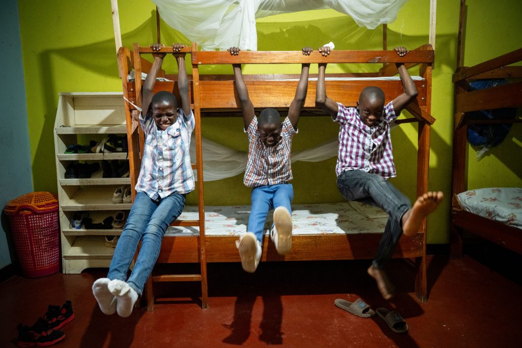 Des jeunes pensionnaires de l’orphelinat dans leur chambre. De g. à d. Kenny, Prince et Divin.