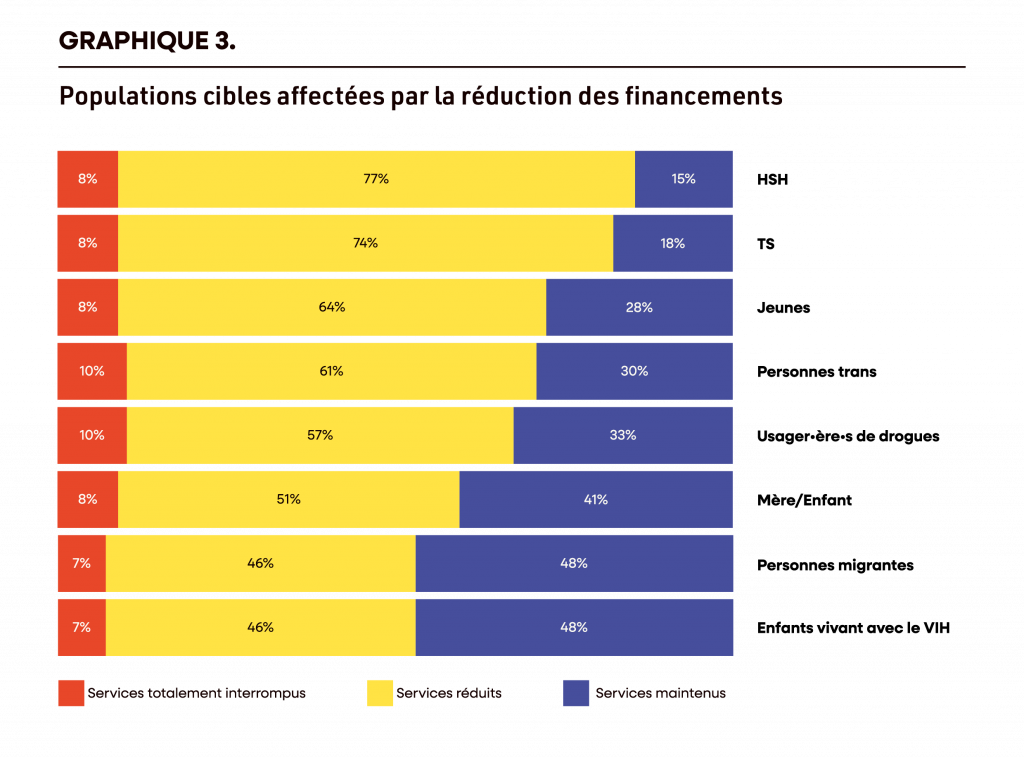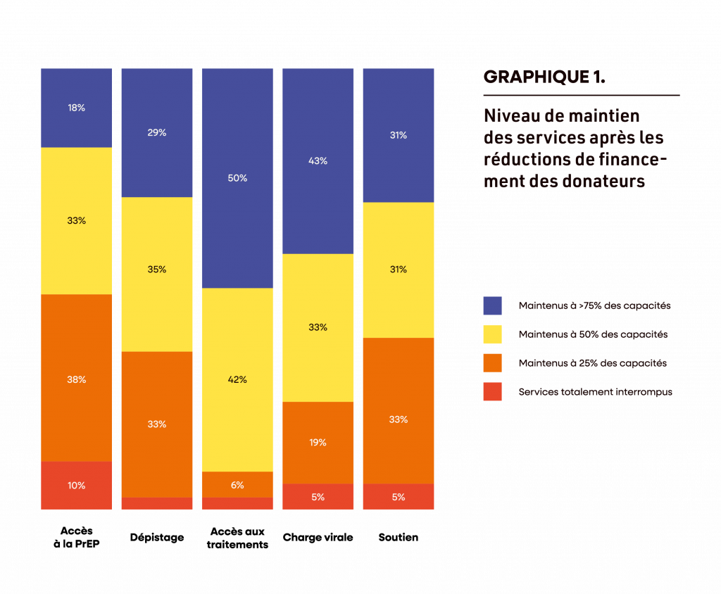 Parmi eux, 77 % ont déclaré que les réductions de financement de la part des donateurs internationaux — notamment le gouvernement américain, le Fonds mondial, ainsi que les coopérations bilatérales française et allemande — ont affecté la prestation de leurs services aux communautés